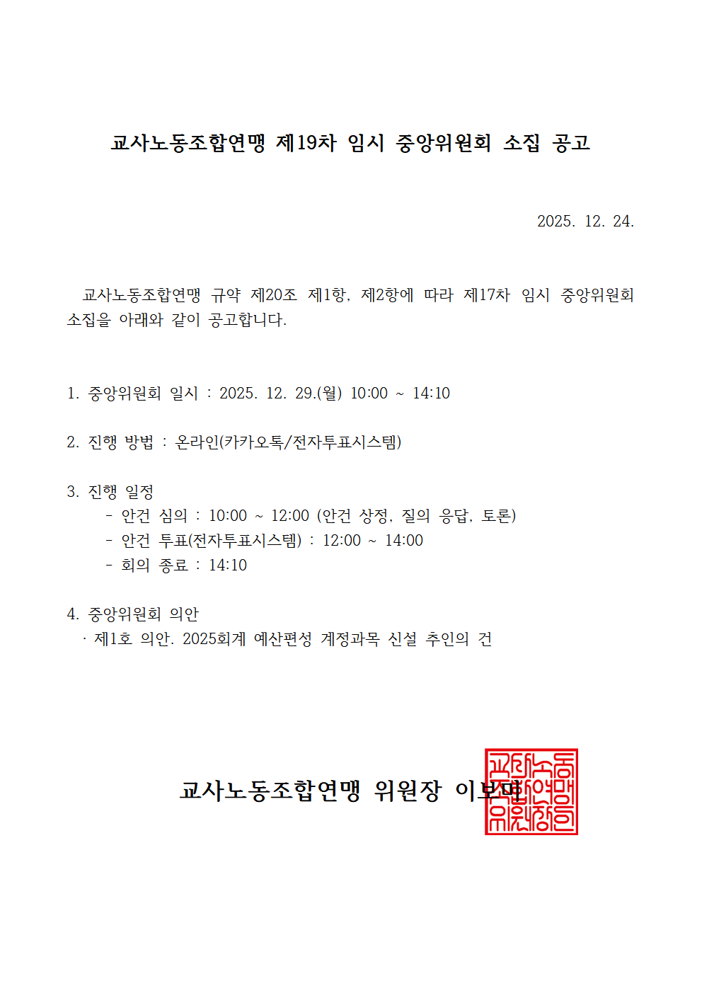 교사노동조합연맹 제19차 임시 중앙위원회 소집 공고 (2025-12-18)